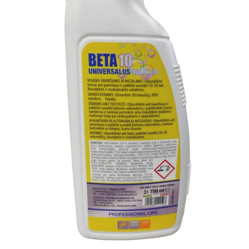 BETA 10 – tai universalus dėmių šalinimo ir riebalų šalinimo produktas, pasižymintis dideliu efektyvumu ir plačiu pritaikymu. Šis valiklis yra puikus pasirinkimas, kai reikia pašalinti įvairias dėmes nuo įvairių paviršių, nepakenkiant jų spalvai ar struktūrai.